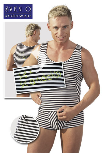 Вызывающий эротический наряд - скандальное боди, для следующих моде мужчин! Шорты на растегивающейся молнии, сбоку декоративная съемная металлическая цепь. Боди сшито из ткани, в черно-белую полоску с неоновой желтой надписью на спине.Разделы: Каталог